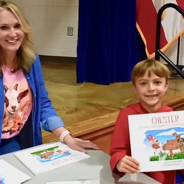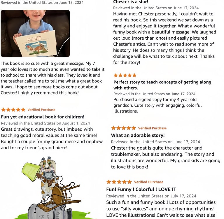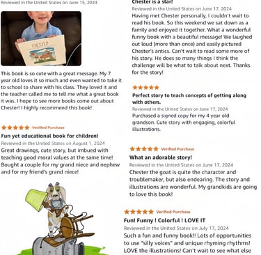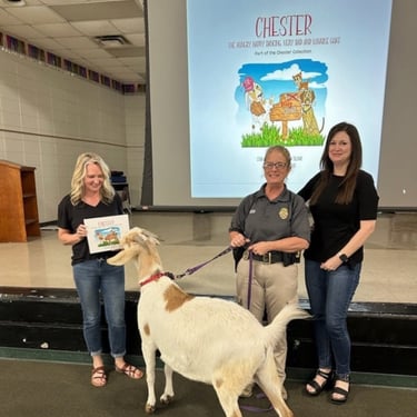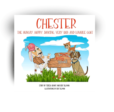 We are a publishing company whose mission is to promote values, lessons, and love by offering books that inspire, entertain, and encourage children. Our newest series of books about Chester, The Hungry, Happy, Dancing, Very Bad and Lovable Goat, always puts a smile on children’s faces. Chester has accompanied us to schools for book readings allowing all children to laugh and engage with him. He adores attention and we are overjoyed to include his “farmily” in the second book and in future books to come.