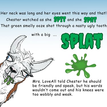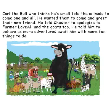 Chester the goat finally meets his “farmily” at the LoveAll Farm. It’s an exciting day filled with fun and mayhem which includes many comical animals. Chester’s mischievous antics while trying to fit in does not escape his new friends like Blue the prideful turkey, Gracie the green slime spitting llama, or Carl the bull who thinks he is still a tiny calf. Chester’s escape from the goat pen lands him in a bit of trouble with Mr. And Mrs. LoveAll as he nabs a yummy treat.