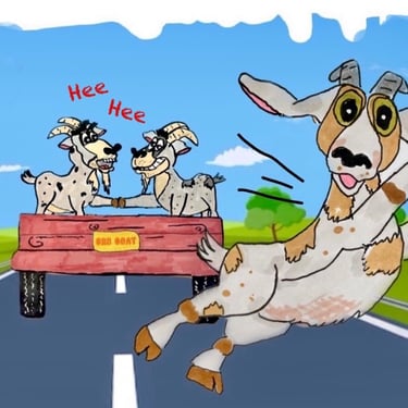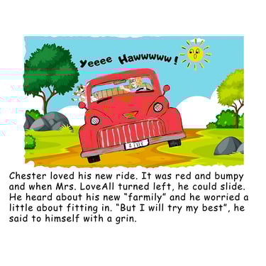 This first book in our Chester series, has him on his first road trip that doesn’t go as he had hoped it would. Chester is bullied by some mean billy bully goats. He is soon rescued by a kind stranger. His own bullying behaviors will have his rescuer’s pets shunning him as he is desperately wishing to be part of the family. These silly characters let him see how he too might be a billy bully. Through his silly and not so good behaviors, he learns about redemption, forgiveness, kindness, and acceptance.